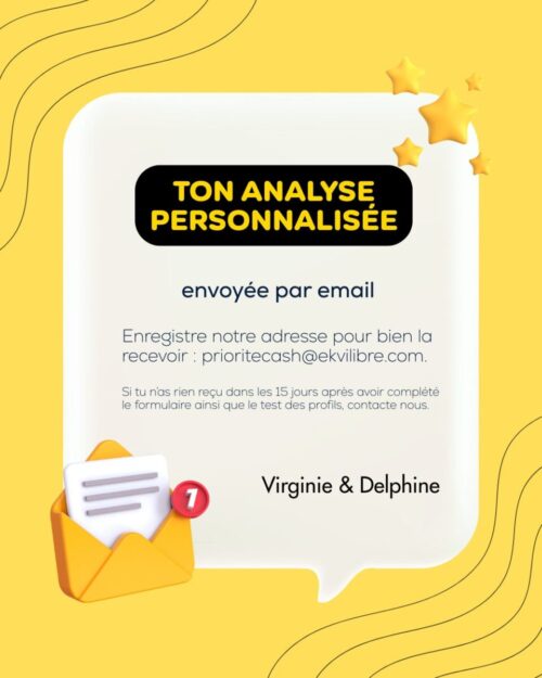 15 jours après avoir fait le test de tes profils financiers et rempli tes éléments d’abondance, Virginie et moi t’enverrons une analyse personnalisée dans laquelle tu trouveras :